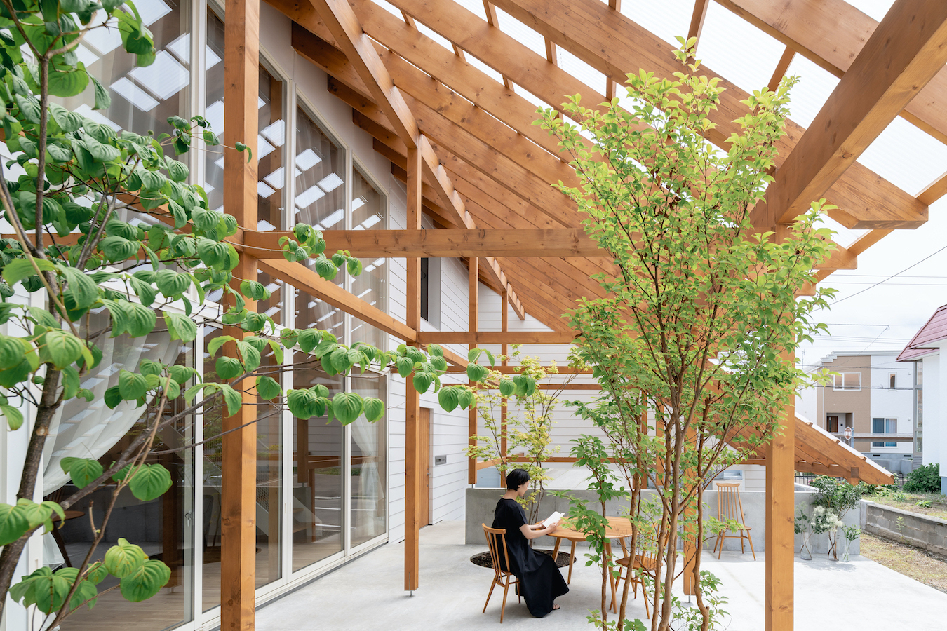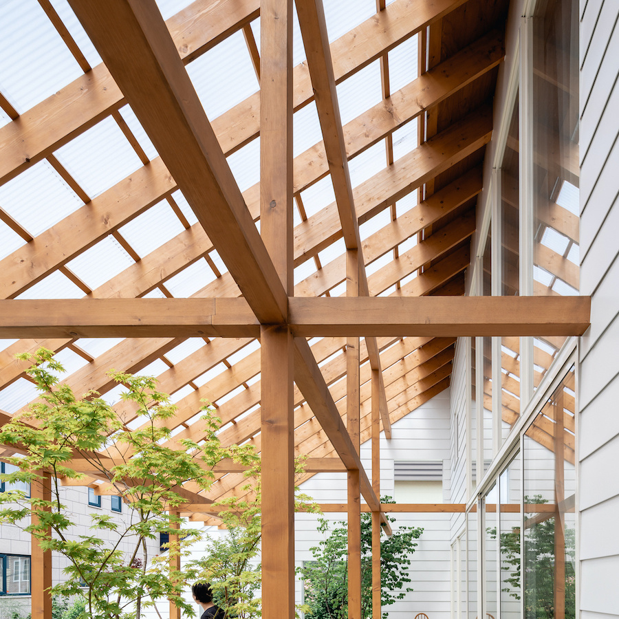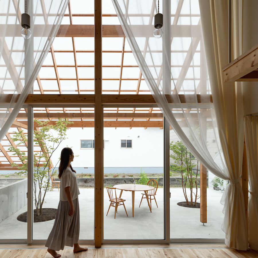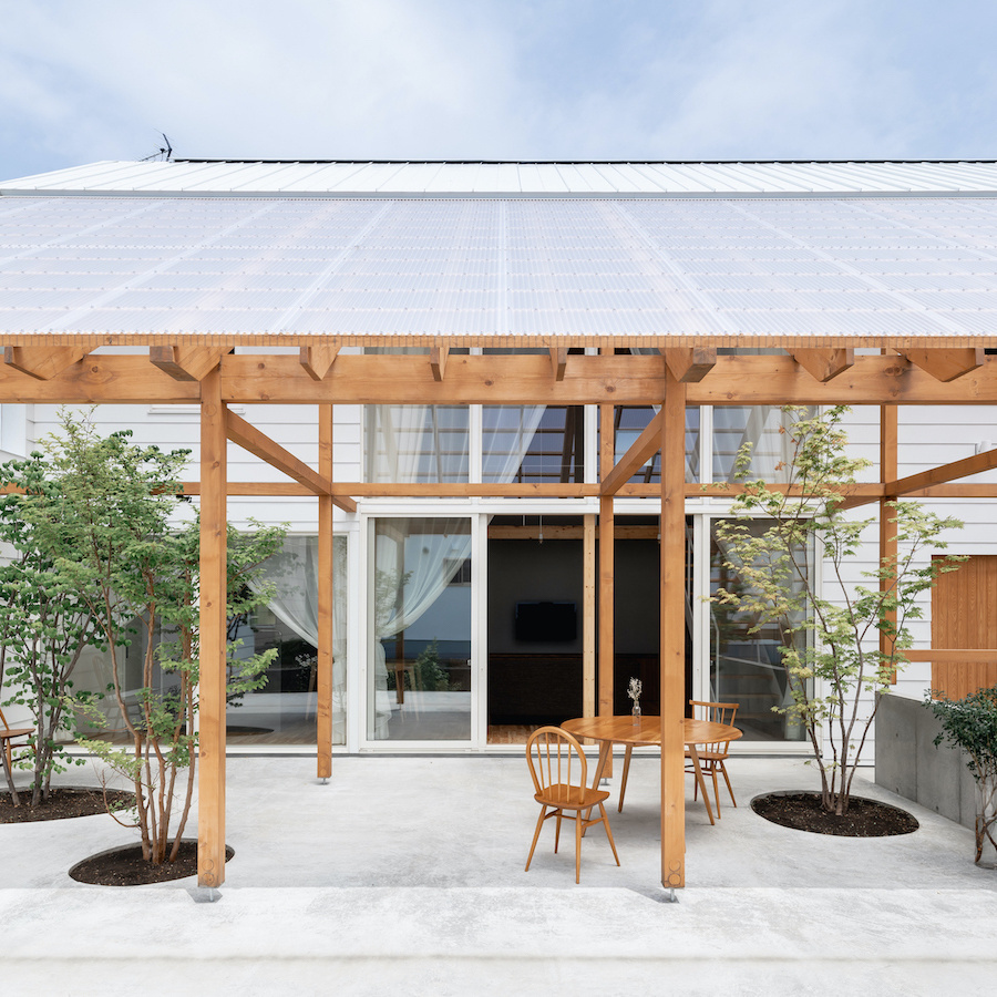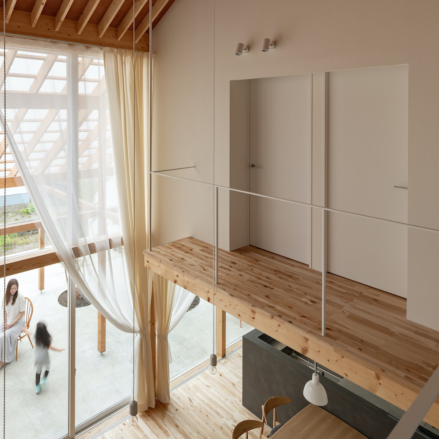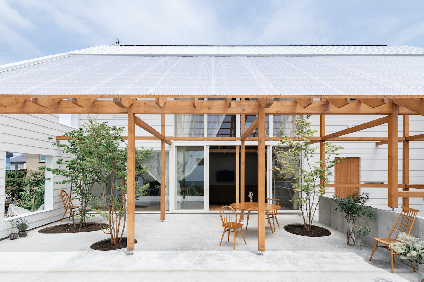 リビング南面に大きな窓を設け、外部に透明の屋根の架かる大きなテラスを設けました。この透明の屋根はテラスを雨や雪から守るだけでなく、夏季の不快な直射日光を拡散光へと変え、室内に柔らかな光を届けます。