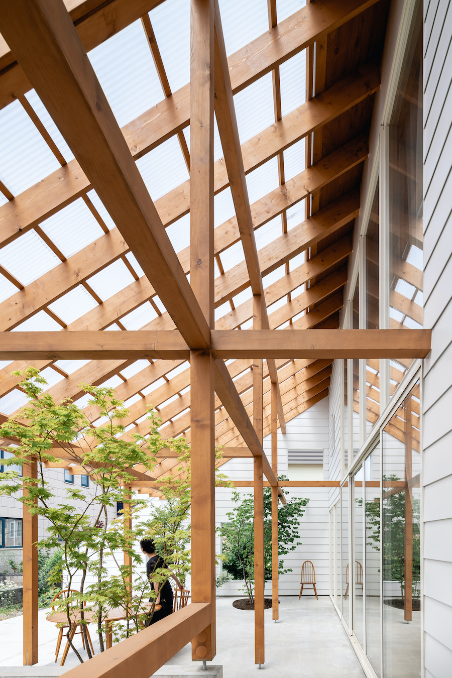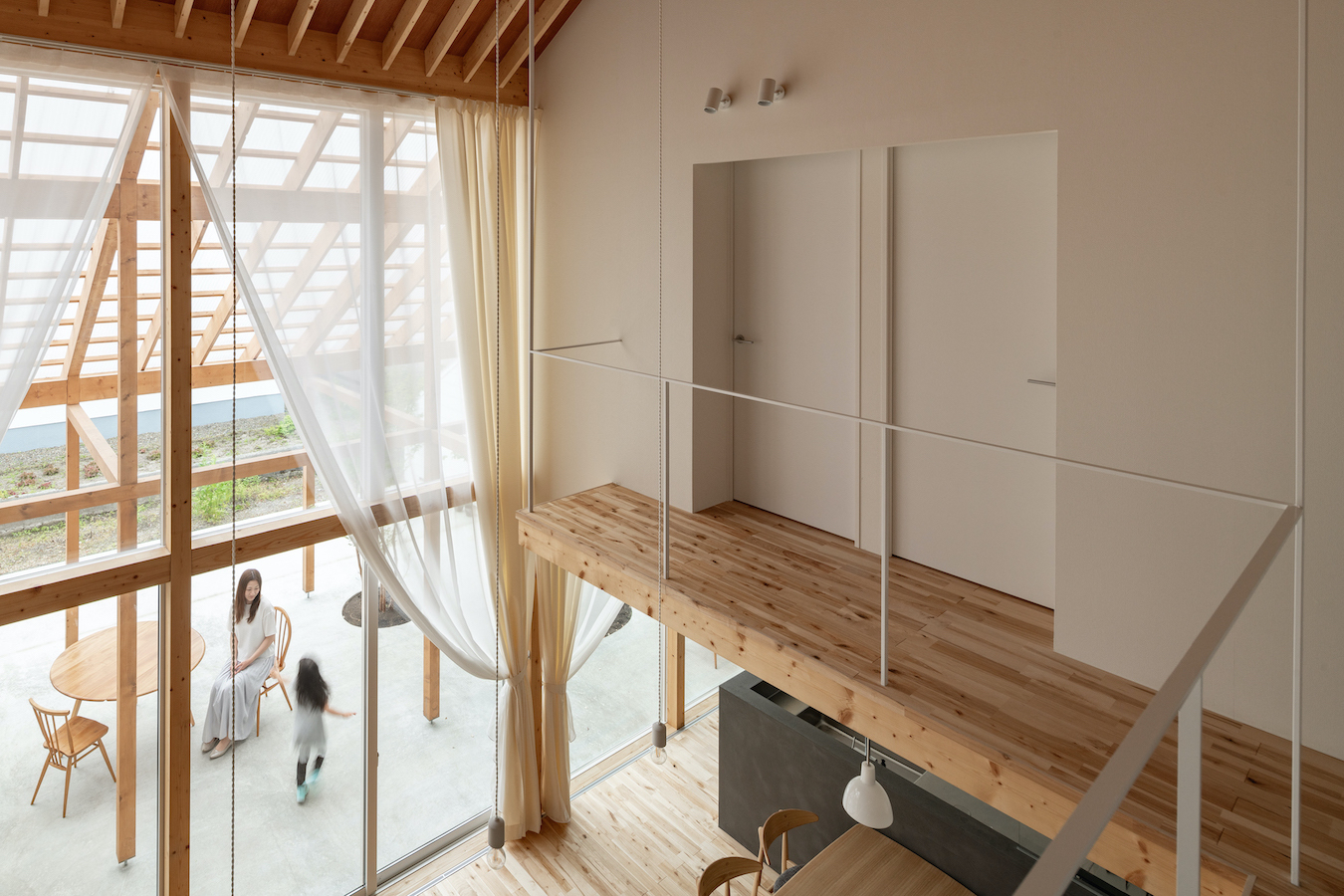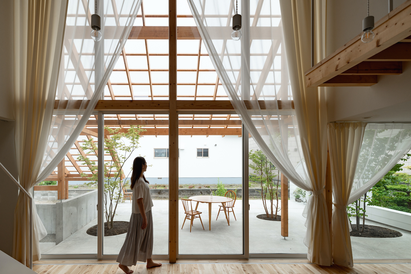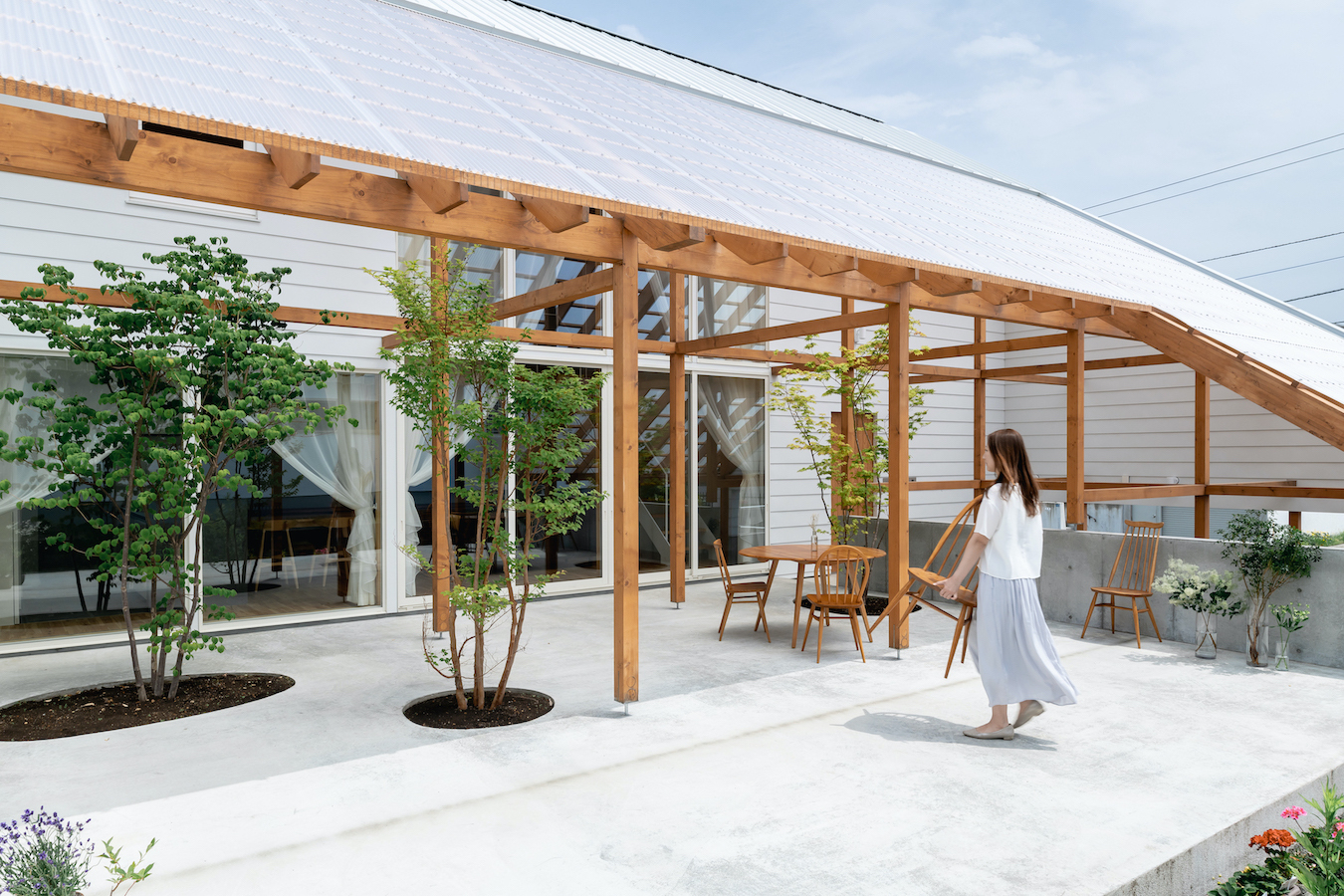 リビング南面に大きな窓を設け、外部に透明の屋根の架かる大きなテラスを設けました。この透明の屋根はテラスを雨や雪から守るだけでなく、夏季の不快な直射日光を拡散光へと変え、室内に柔らかな光を届けます。