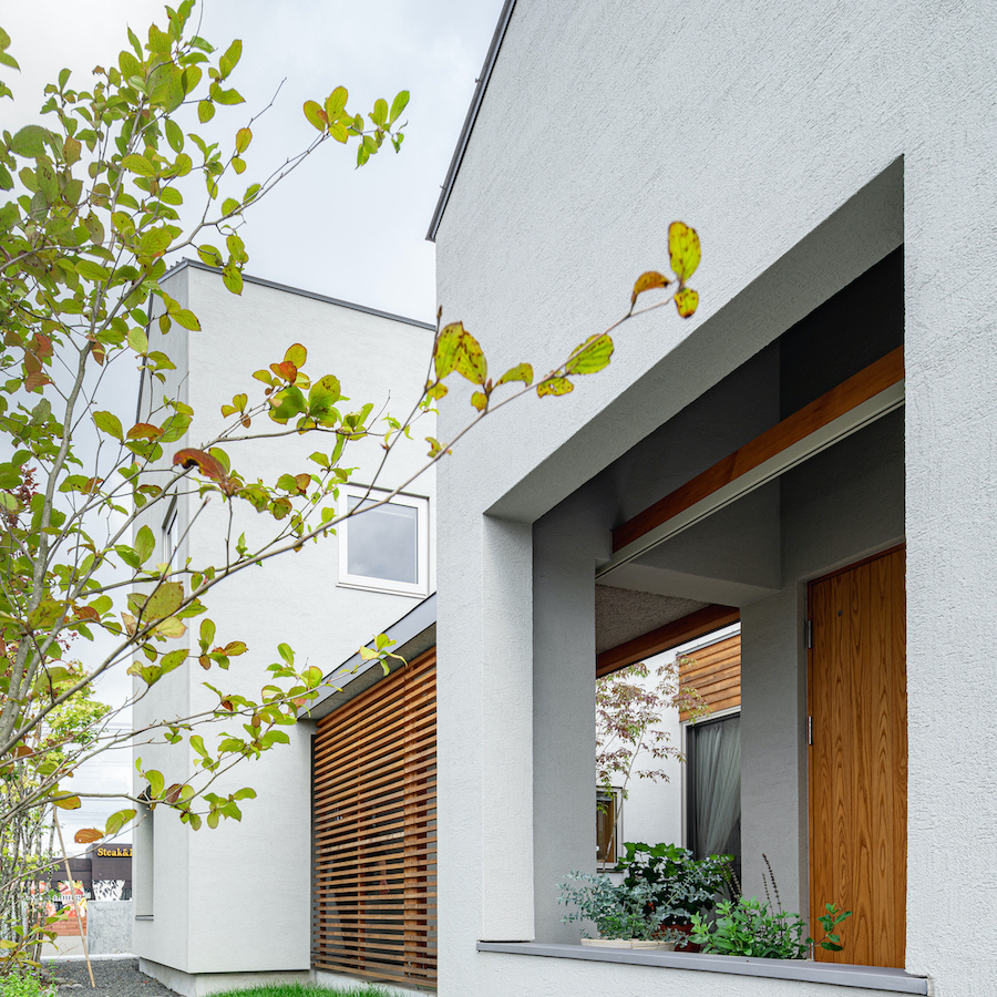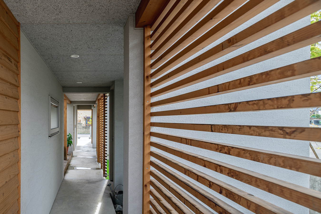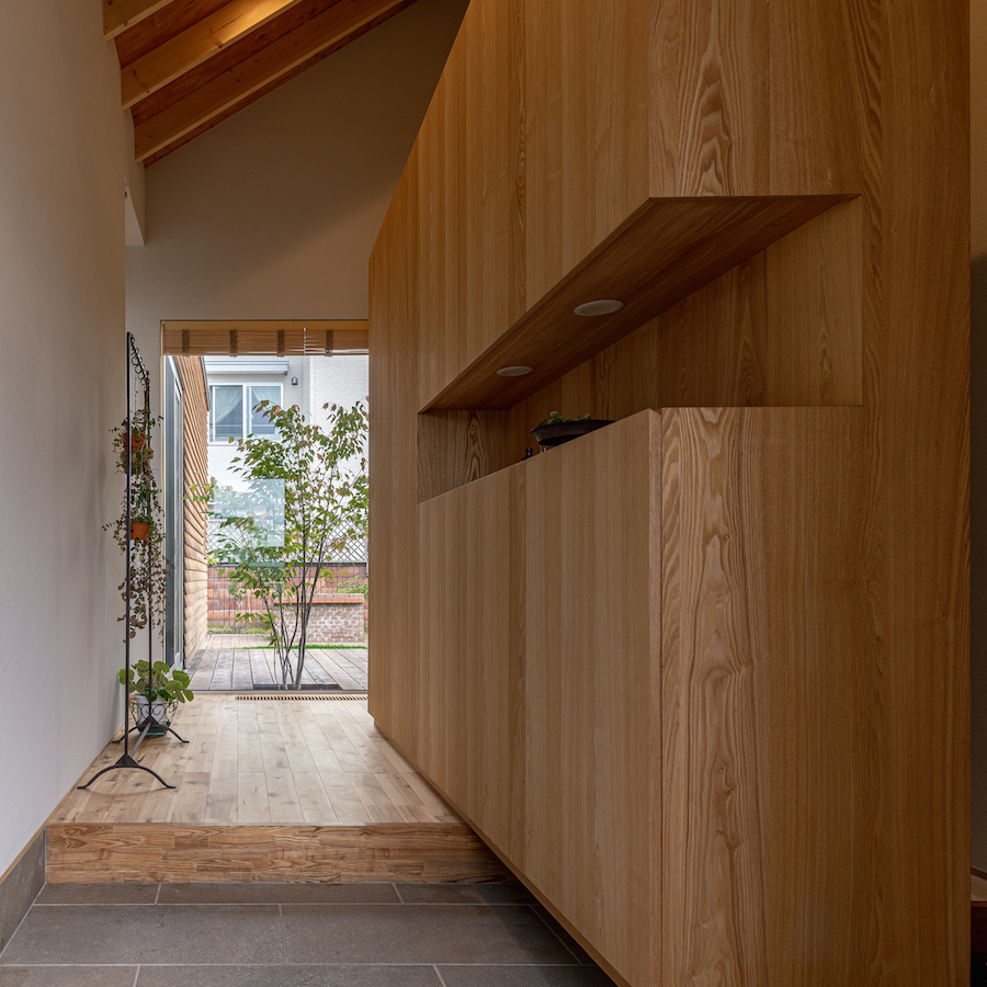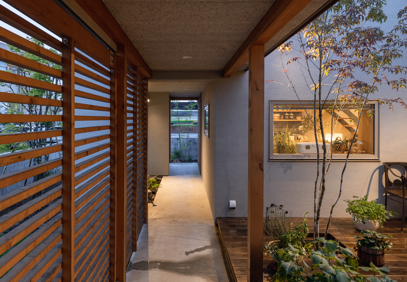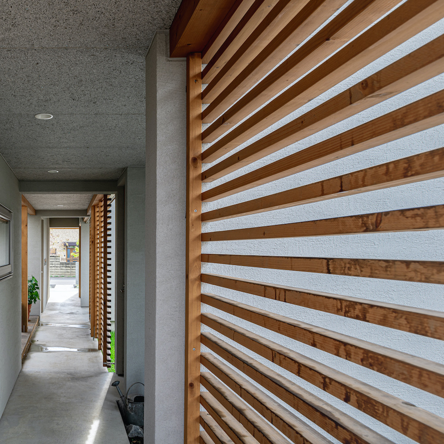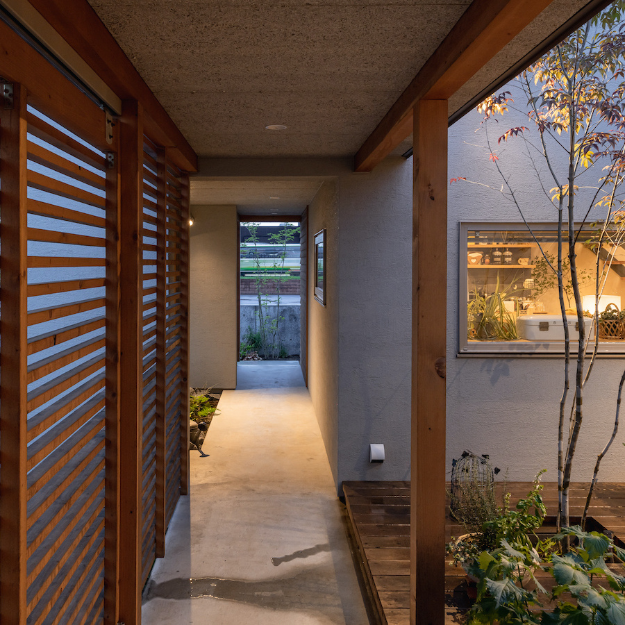 そこで、建物は小さな箱に分割し、それらを数珠繋ぎに並べて小さな街並みのようなものを持つ住宅を提案しました。小さな箱は陸屋根と三角屋根の混合とし、外壁もそれぞれ左官塗りと板張りと異なるものを採用しています。二つある三角屋根の一つはご主人の家、もう一つの三角屋根は奥様の家としてそれぞれの寝室を計画し、お二人の従来の生活を建築的に表現しました。また、箱を数珠繋ぎに並べることで住宅の周りに小さく囲われた居場所がいくつも現れます。それらは、中庭や、ウッドテラス、物干し場、植栽コーナーとなり、家の中だけでなく周りにも賑わいを与えてくれます。次に、それらを貫通する半屋外の通り庭を設けました。前面道路と反対側に会社があるため、住宅の玄関から通り庭を通って前面道路側にも会社側にもアクセスできるようにするためです。この通り庭にはたくさんの異なる要素を付随させました。ルーバー越しに光が入る場所、三角屋根の内部、外壁がくりぬかれたベンチのある場所、玄関ドア、中庭の一部になっている場所、物置、樹木のある箱庭、キッチンの様子が見える窓などです。