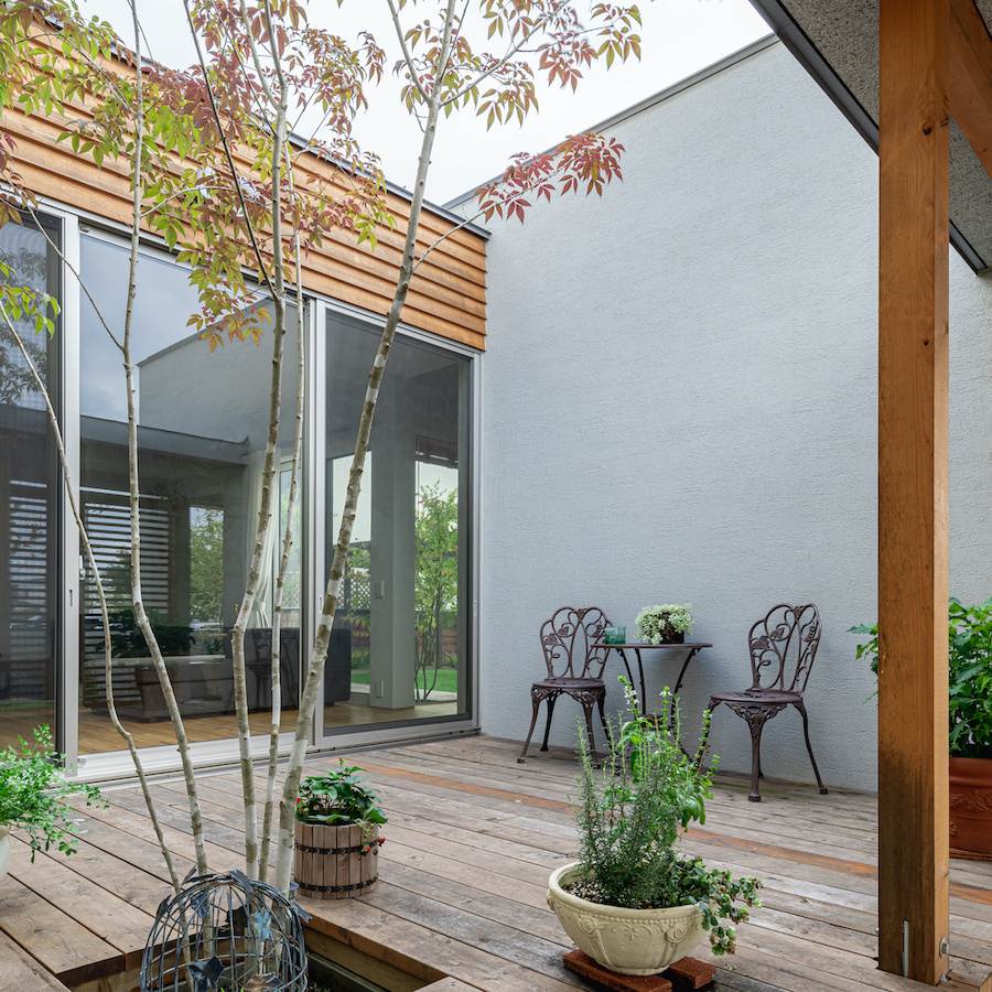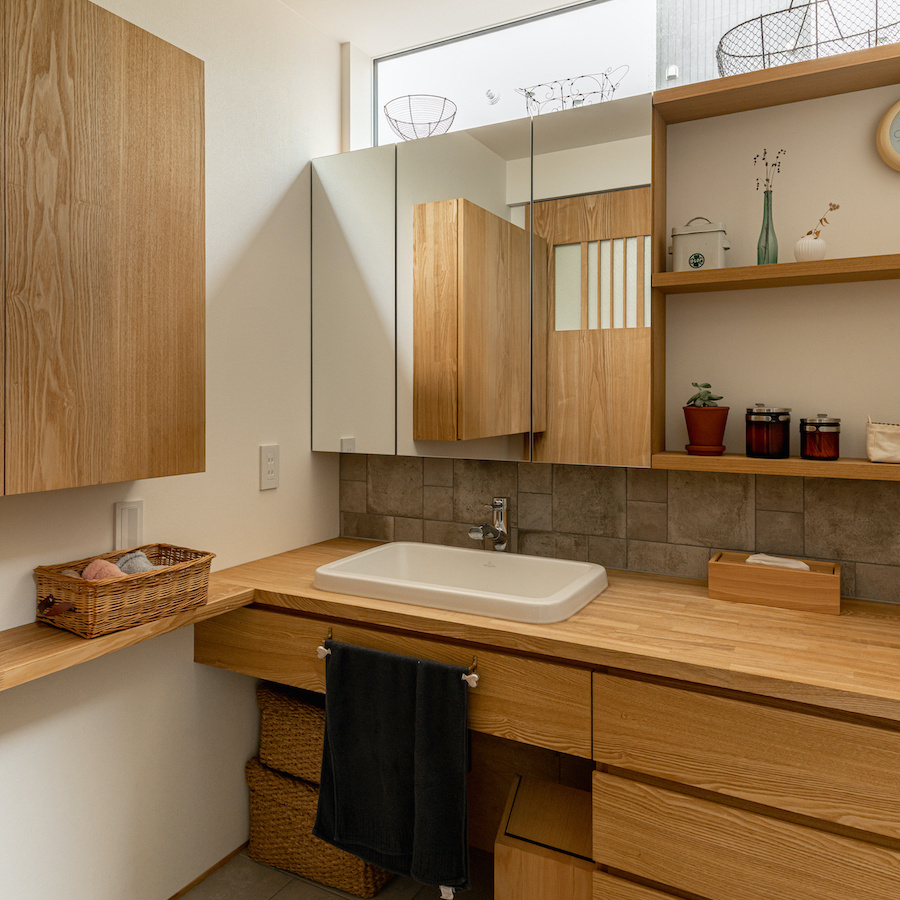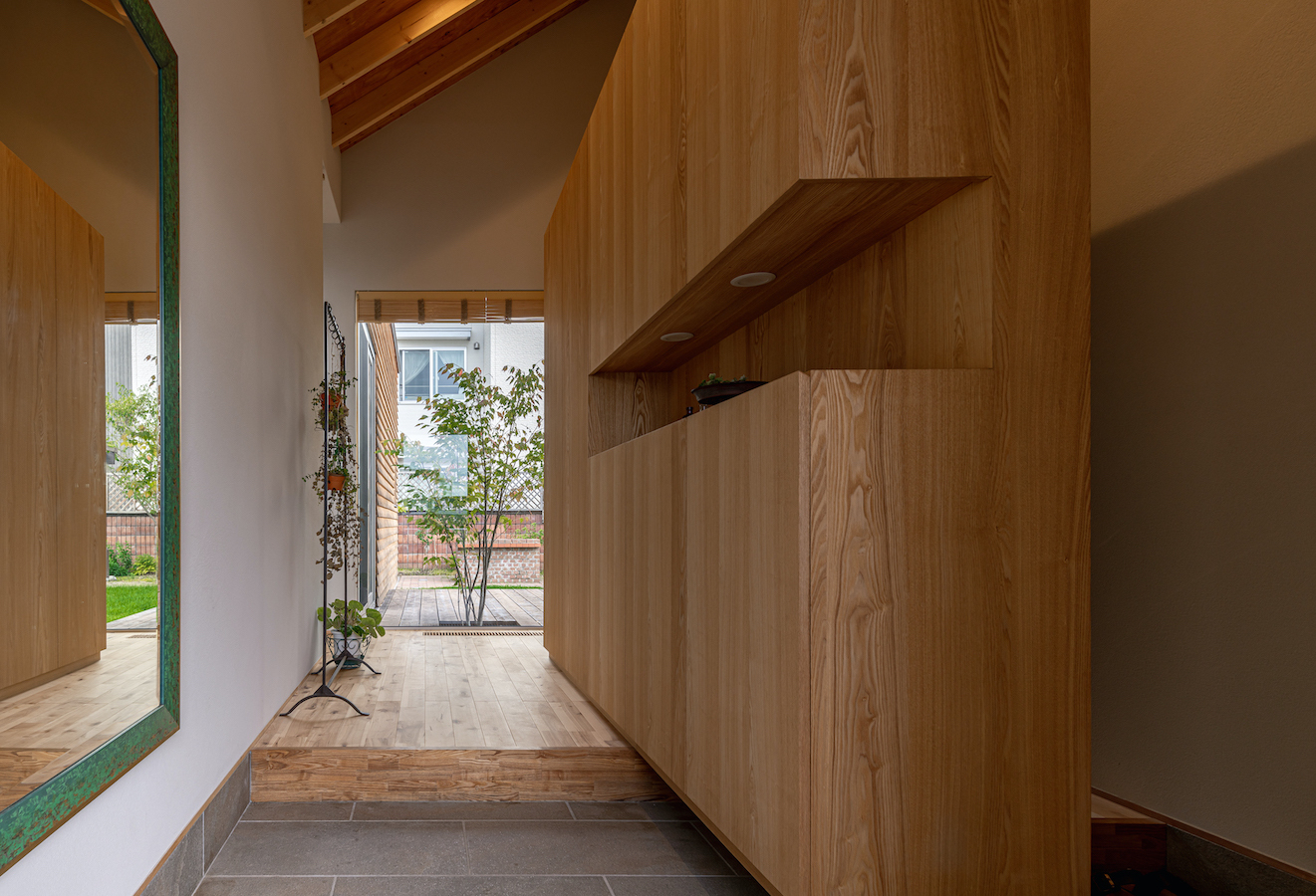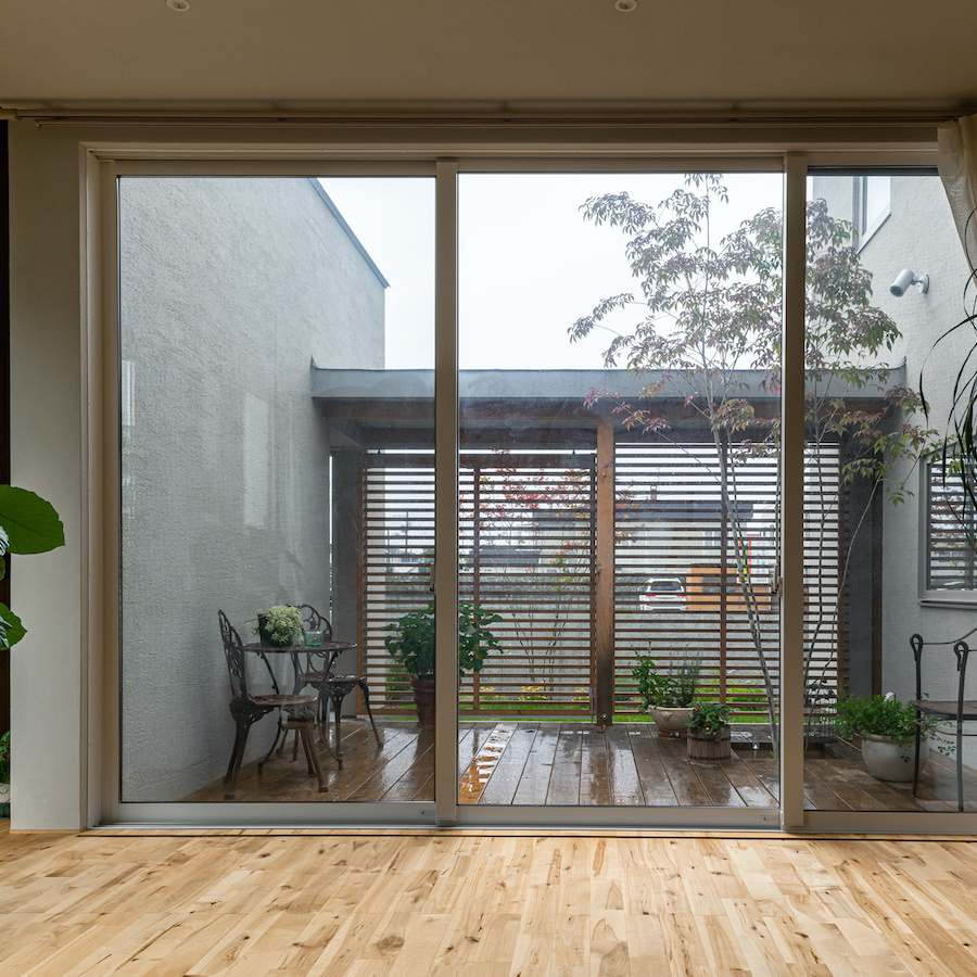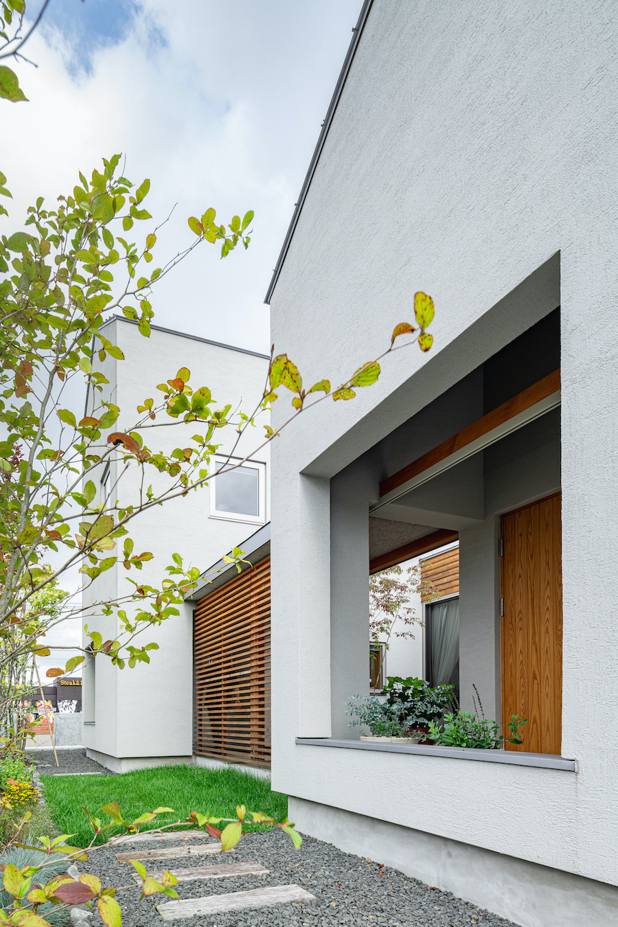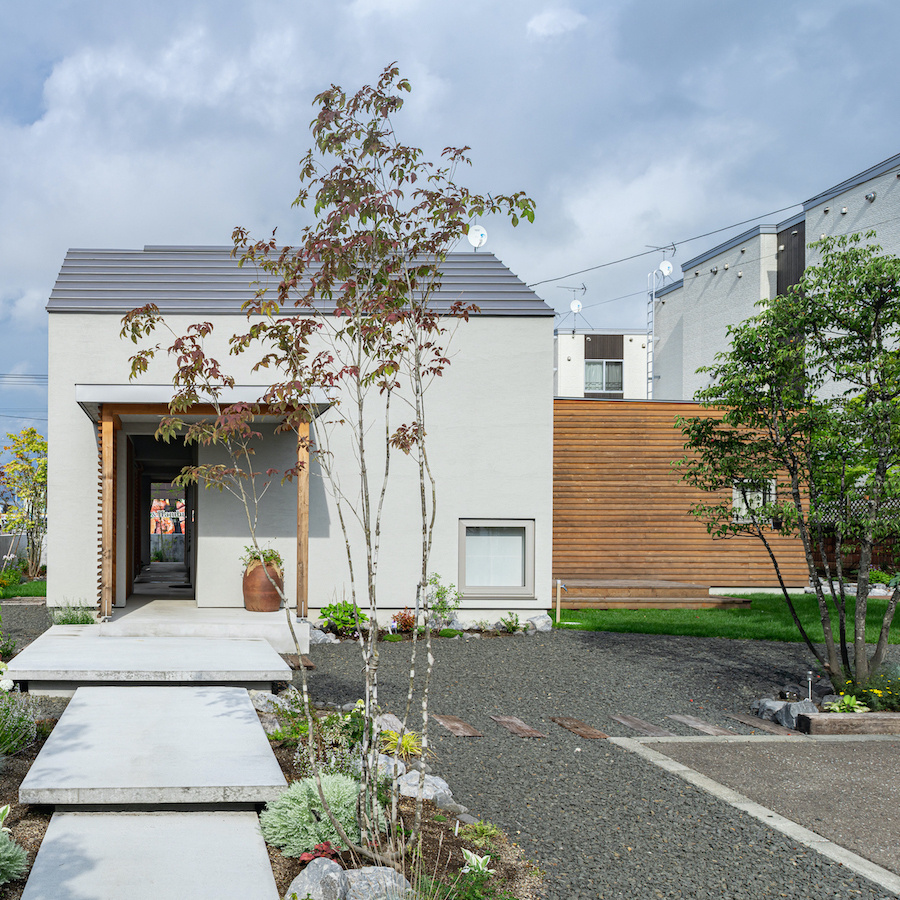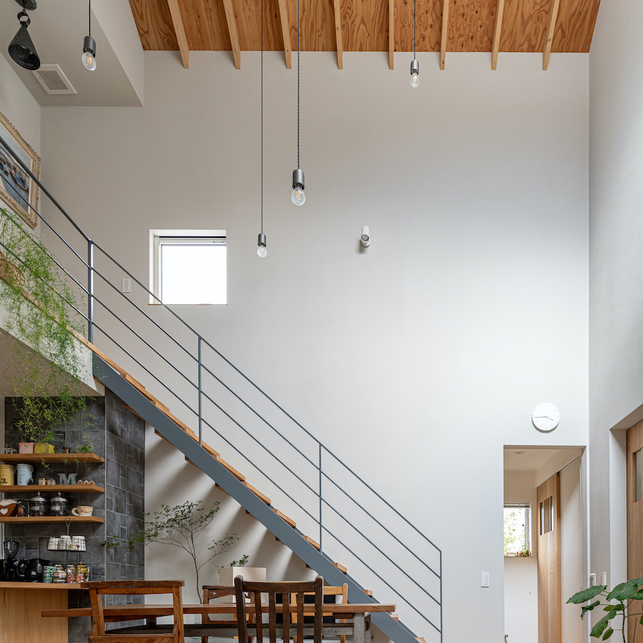 そこで、建物は小さな箱に分割し、それらを数珠繋ぎに並べて小さな街並みのようなものを持つ住宅を提案しました。小さな箱は陸屋根と三角屋根の混合とし、外壁もそれぞれ左官塗りと板張りと異なるものを採用しています。二つある三角屋根の一つはご主人の家、もう一つの三角屋根は奥様の家としてそれぞれの寝室を計画し、お二人の従来の生活を建築的に表現しました。また、箱を数珠繋ぎに並べることで住宅の周りに小さく囲われた居場所がいくつも現れます。それらは、中庭や、ウッドテラス、物干し場、植栽コーナーとなり、家の中だけでなく周りにも賑わいを与えてくれます。次に、それらを貫通する半屋外の通り庭を設けました。前面道路と反対側に会社があるため、住宅の玄関から通り庭を通って前面道路側にも会社側にもアクセスできるようにするためです。この通り庭にはたくさんの異なる要素を付随させました。ルーバー越しに光が入る場所、三角屋根の内部、外壁がくりぬかれたベンチのある場所、玄関ドア、中庭の一部になっている場所、物置、樹木のある箱庭、キッチンの様子が見える窓などです。