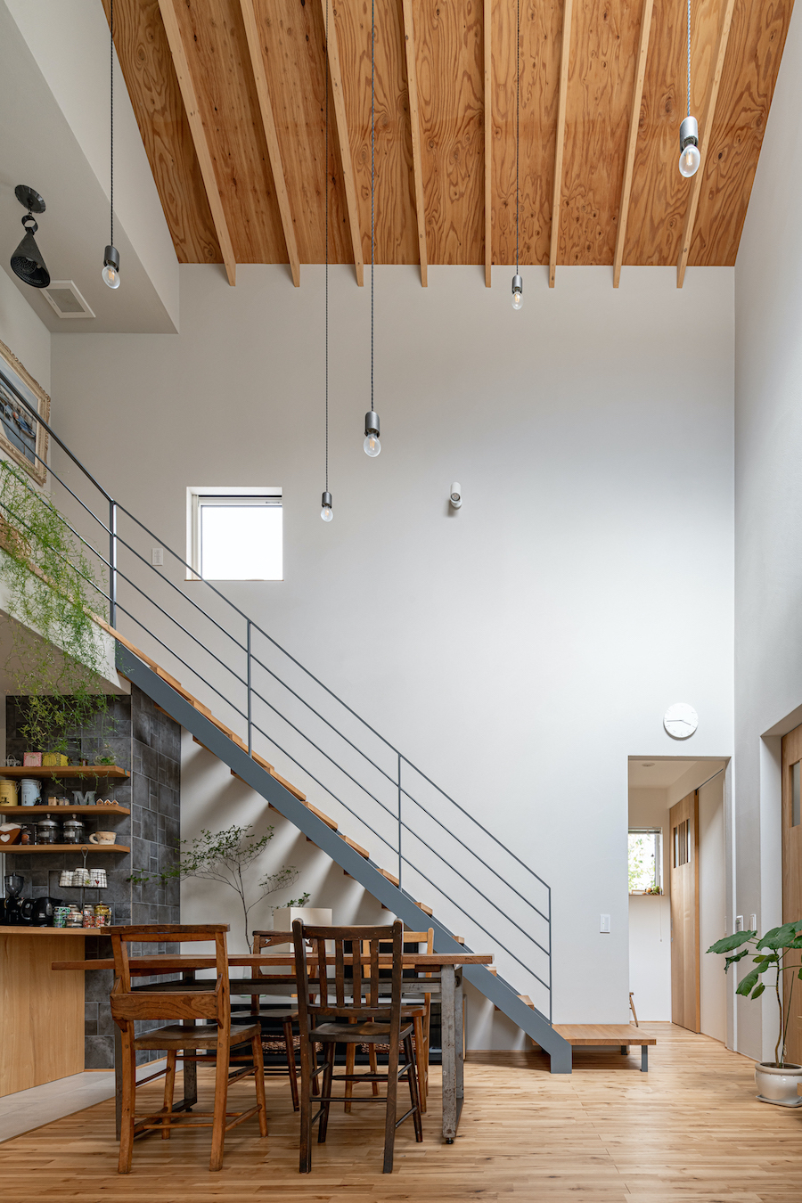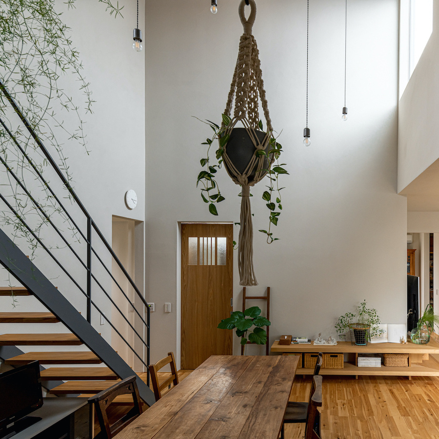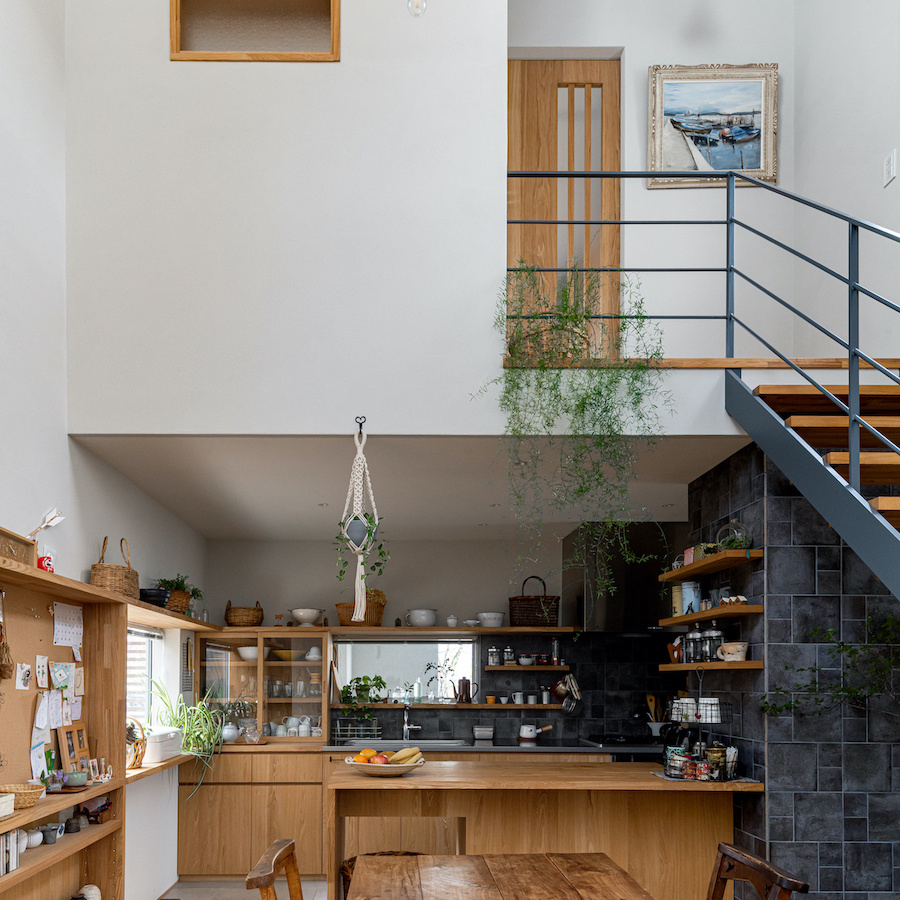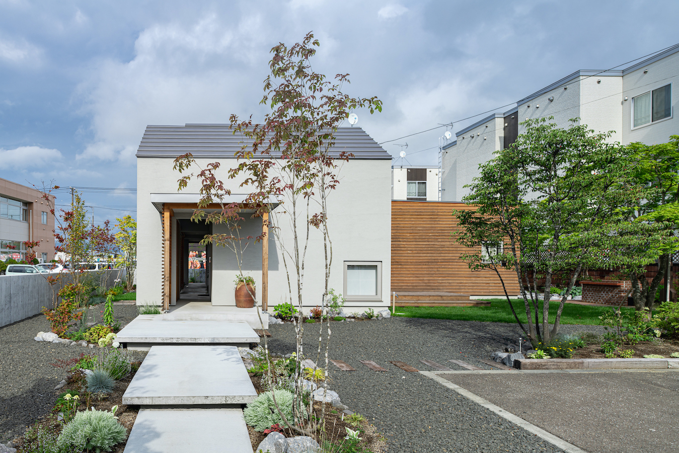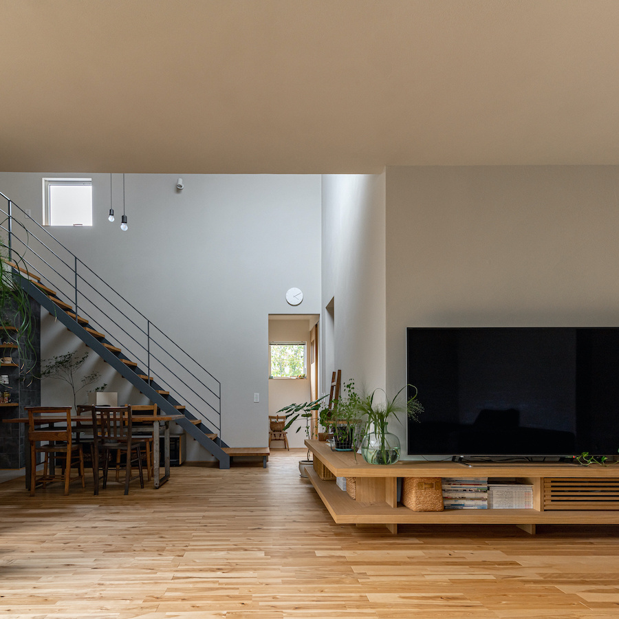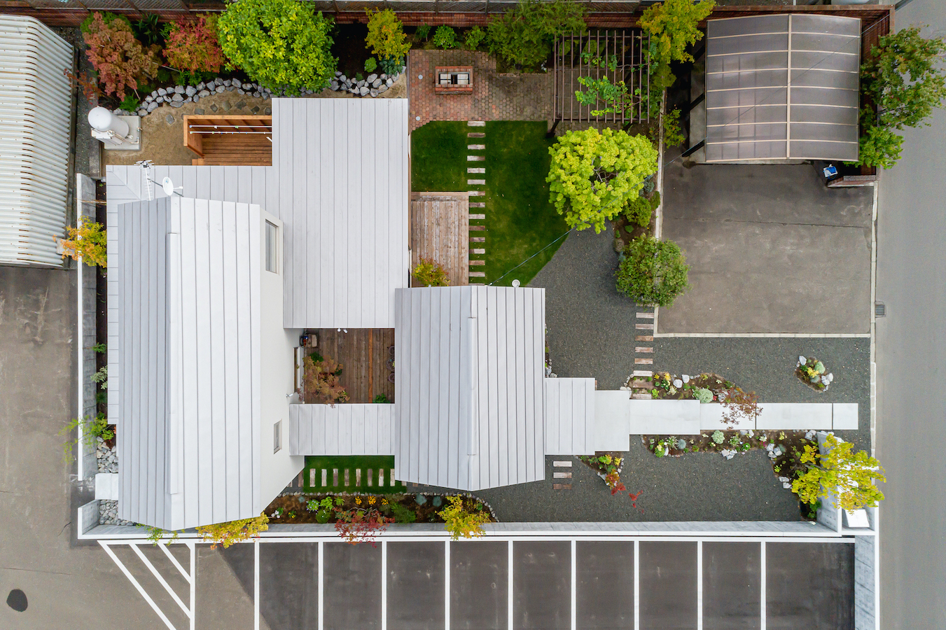 そこで、建物は小さな箱に分割し、それらを数珠繋ぎに並べて小さな街並みのようなものを持つ住宅を提案しました。小さな箱は陸屋根と三角屋根の混合とし、外壁もそれぞれ左官塗りと板張りと異なるものを採用しています。二つある三角屋根の一つはご主人の家、もう一つの三角屋根は奥様の家としてそれぞれの寝室を計画し、お二人の従来の生活を建築的に表現しました。また、箱を数珠繋ぎに並べることで住宅の周りに小さく囲われた居場所がいくつも現れます。それらは、中庭や、ウッドテラス、物干し場、植栽コーナーとなり、家の中だけでなく周りにも賑わいを与えてくれます。次に、それらを貫通する半屋外の通り庭を設けました。前面道路と反対側に会社があるため、住宅の玄関から通り庭を通って前面道路側にも会社側にもアクセスできるようにするためです。この通り庭にはたくさんの異なる要素を付随させました。ルーバー越しに光が入る場所、三角屋根の内部、外壁がくりぬかれたベンチのある場所、玄関ドア、中庭の一部になっている場所、物置、樹木のある箱庭、キッチンの様子が見える窓などです。