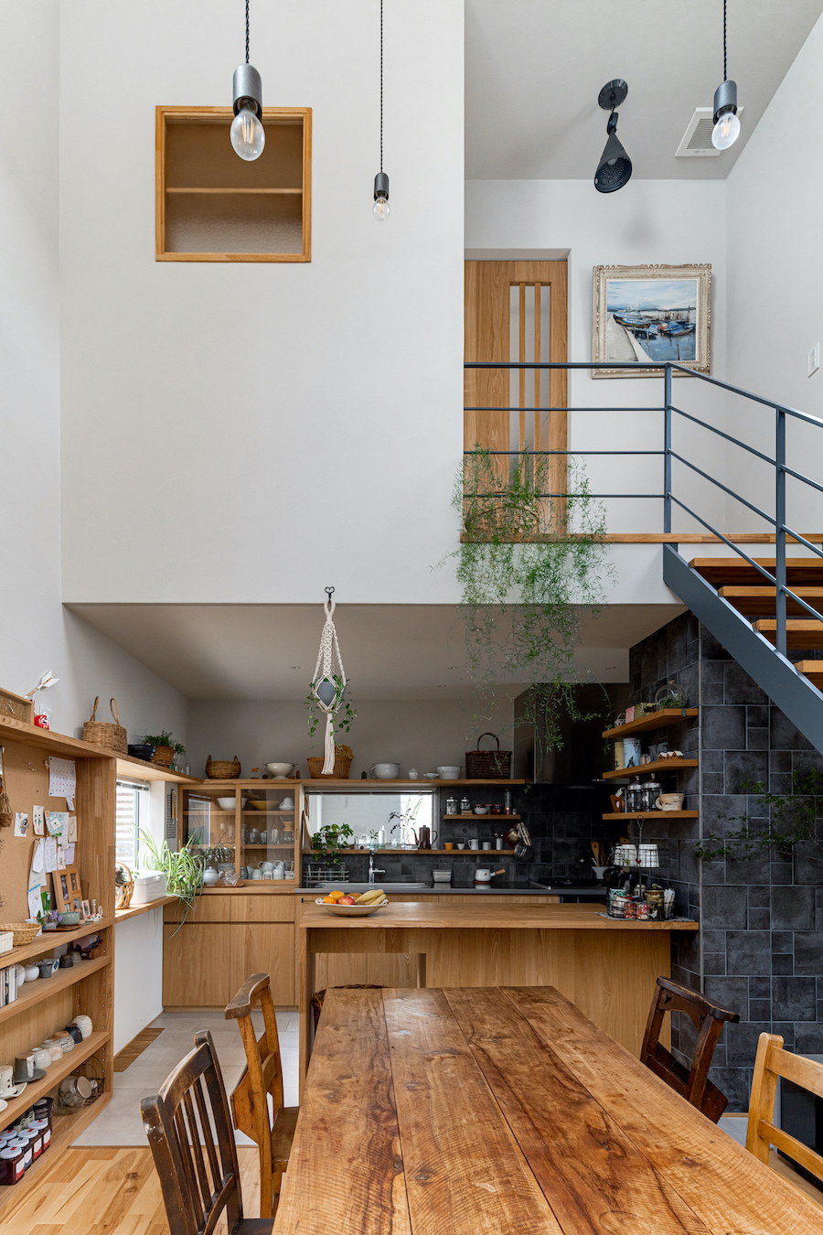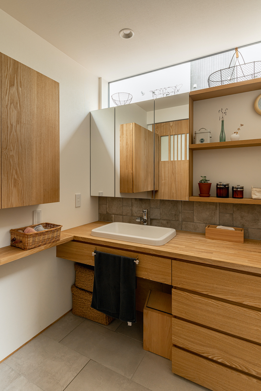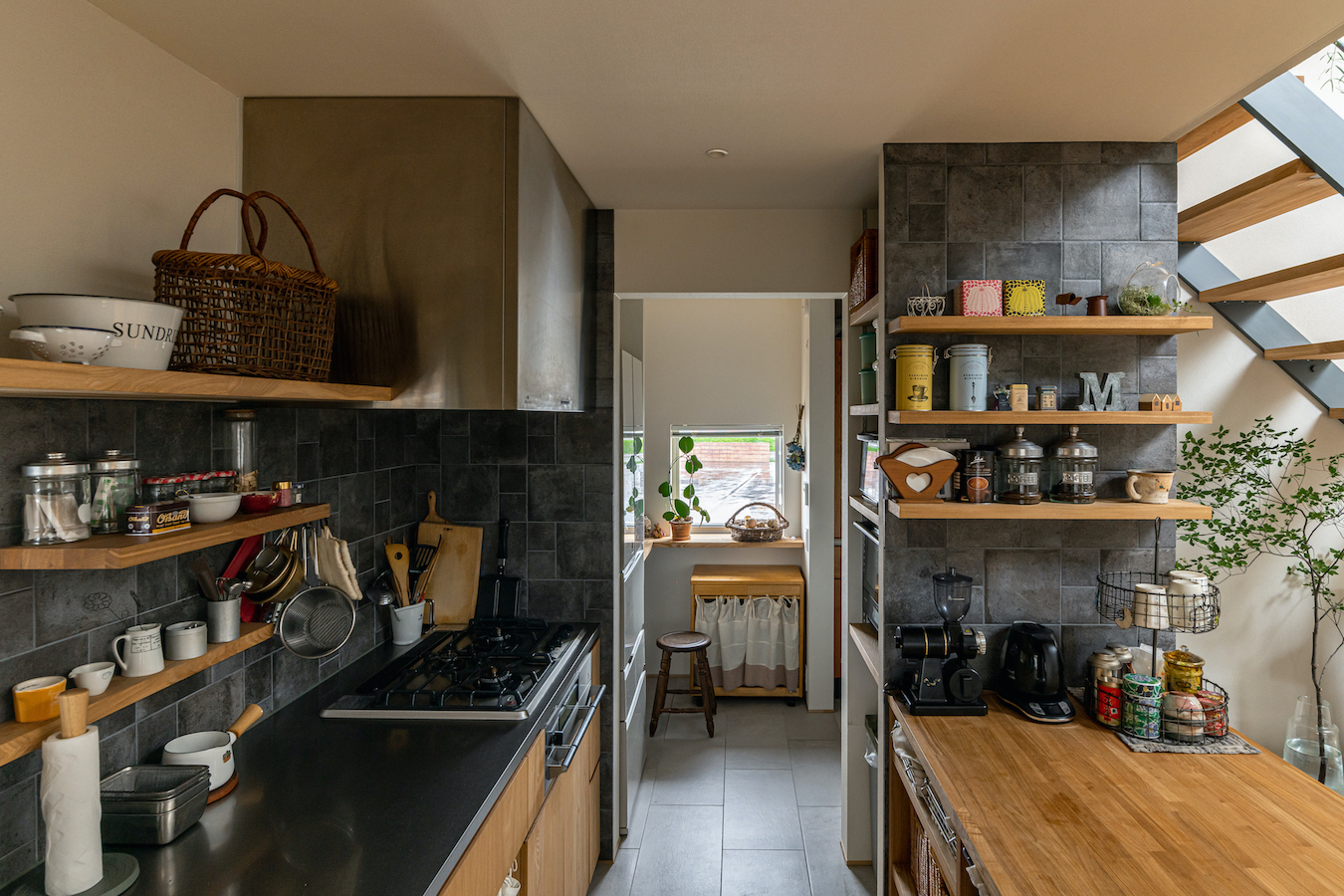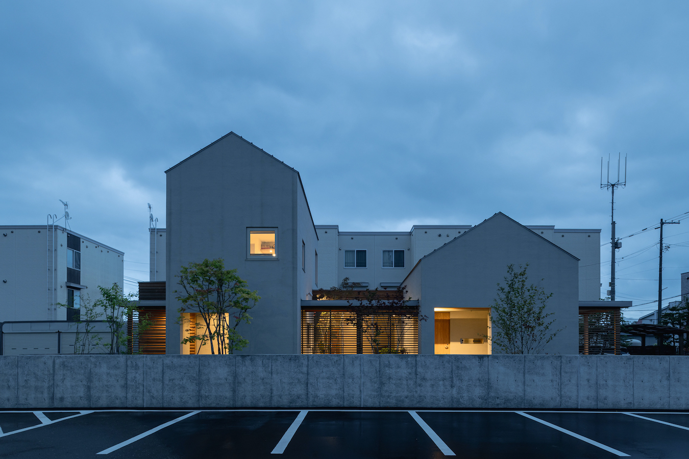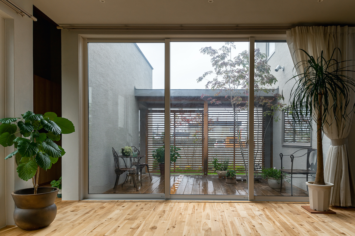 そこで、建物は小さな箱に分割し、それらを数珠繋ぎに並べて小さな街並みのようなものを持つ住宅を提案しました。小さな箱は陸屋根と三角屋根の混合とし、外壁もそれぞれ左官塗りと板張りと異なるものを採用しています。二つある三角屋根の一つはご主人の家、もう一つの三角屋根は奥様の家としてそれぞれの寝室を計画し、お二人の従来の生活を建築的に表現しました。また、箱を数珠繋ぎに並べることで住宅の周りに小さく囲われた居場所がいくつも現れます。それらは、中庭や、ウッドテラス、物干し場、植栽コーナーとなり、家の中だけでなく周りにも賑わいを与えてくれます。次に、それらを貫通する半屋外の通り庭を設けました。前面道路と反対側に会社があるため、住宅の玄関から通り庭を通って前面道路側にも会社側にもアクセスできるようにするためです。この通り庭にはたくさんの異なる要素を付随させました。ルーバー越しに光が入る場所、三角屋根の内部、外壁がくりぬかれたベンチのある場所、玄関ドア、中庭の一部になっている場所、物置、樹木のある箱庭、キッチンの様子が見える窓などです。