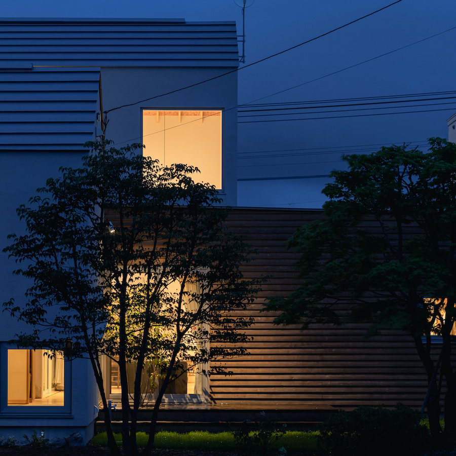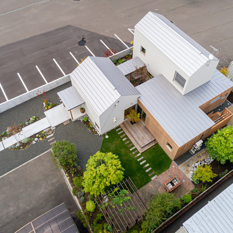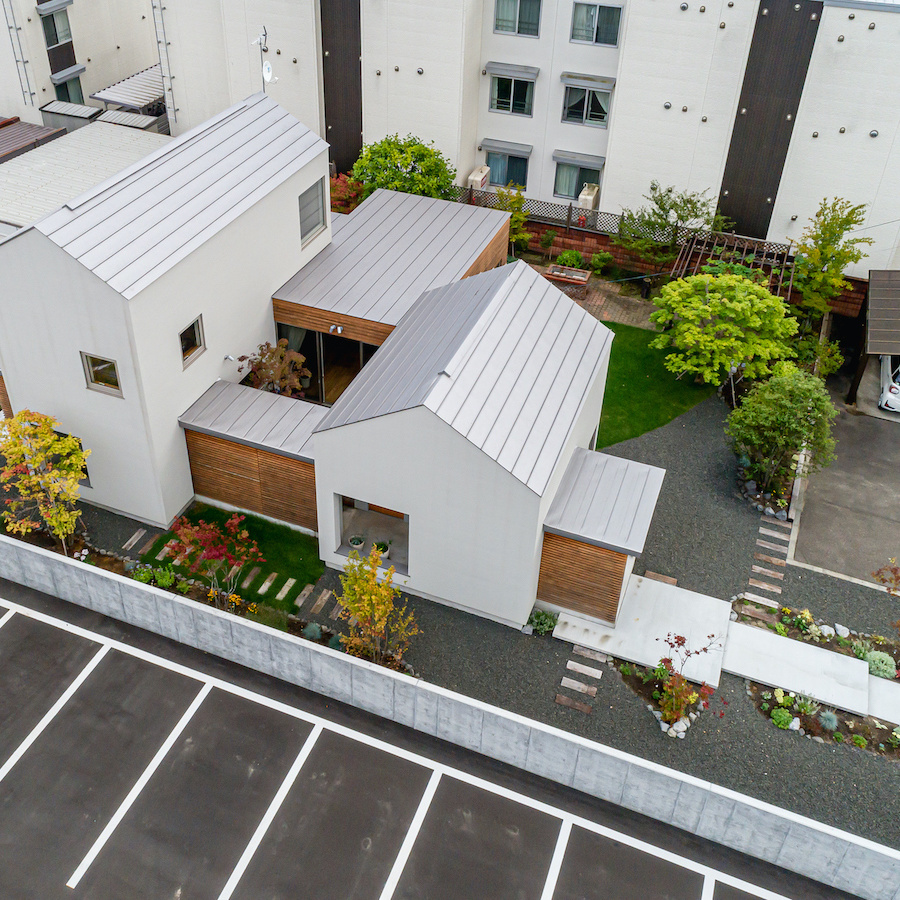 北海道恵庭市に60代のご夫婦のために計画した住宅です。恵庭市は北海道の玄関口である新千歳空港と北海道の中心である札幌市との中間に位置する恵まれた交通アクセスと、穏やかな気候風土もつ人口約7万人の町です。