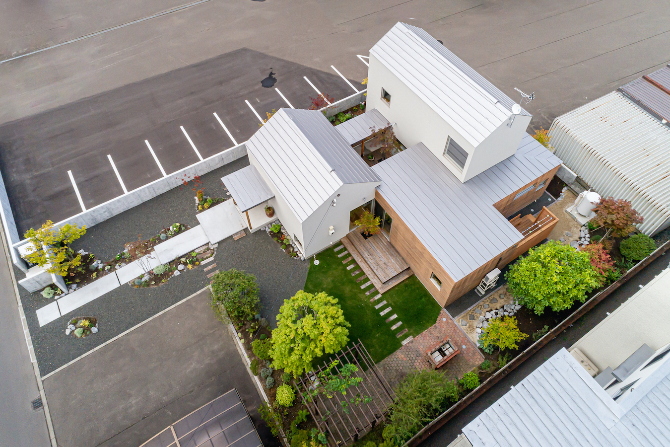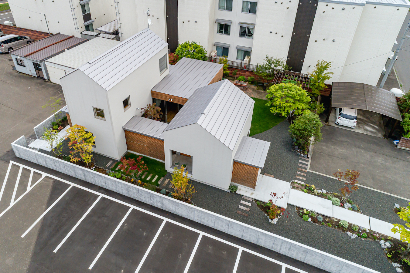 本計画では、親の古家とオーナーの既存住宅を解体し、住宅を新築すると共に会社の駐車場増設を行いました。